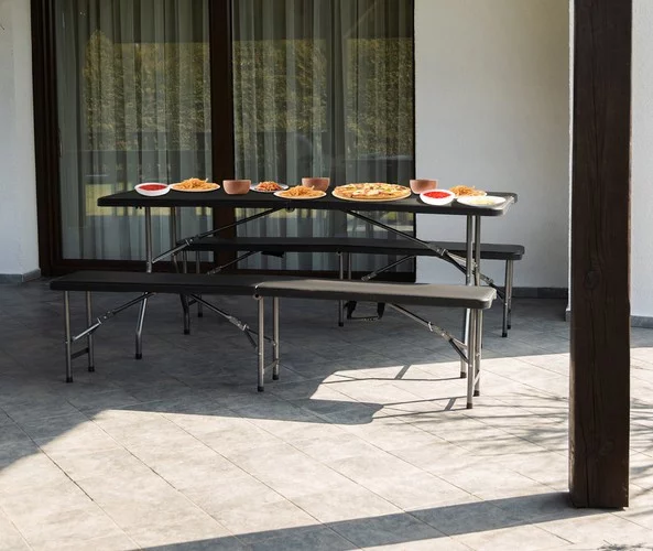 Praktyczny zestaw na przyjęcia ogrodowe, grillowanie, catering i większe wydarzenia, który oferuje stabilność, szybkie rozkładanie i łatwe przechowywanie. Dzięki solidnej stalowej konstrukcji i wytrzymałej płycie HDPE poradzi sobie nawet w trudnych warunkach zewnętrznych i wygodnie pomieści do 6 osób.