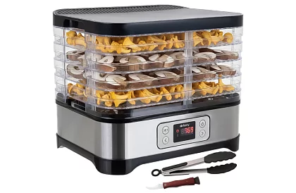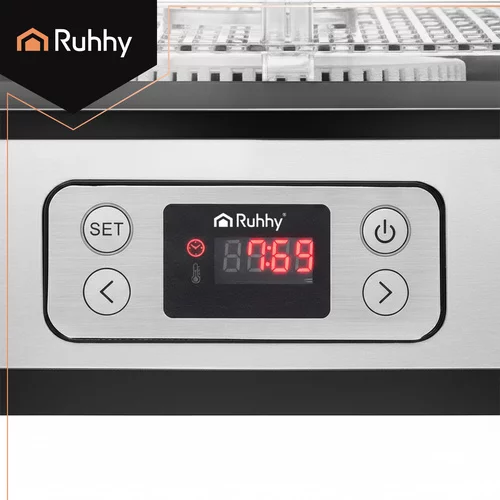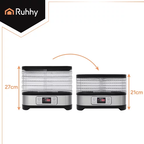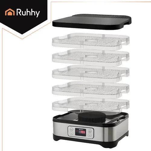 Suszarka do żywności RUHHY umożliwia łatwe przygotowanie domowych zapasów na cały rok. Równomiernie suszy grzyby, owoce, warzywa i zioła dzięki 5 tacą o pojemności 10 litrów, precyzyjnej regulacji temperatury 35–70 °C i 24-godzinnemu timerowi. Przejrzysty wyświetlacz LCD i intuicyjny panel sterujący zapewniają wygodne, czyste i energooszczędne suszenie, podczas gdy zestaw praktycznych akcesoriów umożliwia natychmiastowe użycie i uniwersalne przetwarzanie surowców.