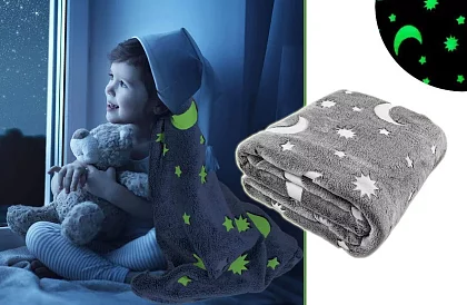 Bardzo przyjemny połyskujący kocyk z mikrofibry zapewni maksymalny komfort! Kocyk wykonany jest z puszystego materiału i jest bardzo przyjemny w dotyku. Wyjątkową cechą tego koca jest to, że pięknie świeci w ciemności. Dlatego pokochają go nie tylko Twoje dzieci. Zasypianie to już nowy problem. Wystarczy pozostawić koc na słońcu lub w oświetleniu wewnętrznym w ciągu dnia. Koc w naturalny sposób „ładuje się”, by wieczorem świecić i pomagał odpędzić strach przed ciemnością. Dzięki nowoczesnemu wzornictwu kocyk pomoże nie tylko w pokoju dziecięcym, ale również w salonie.