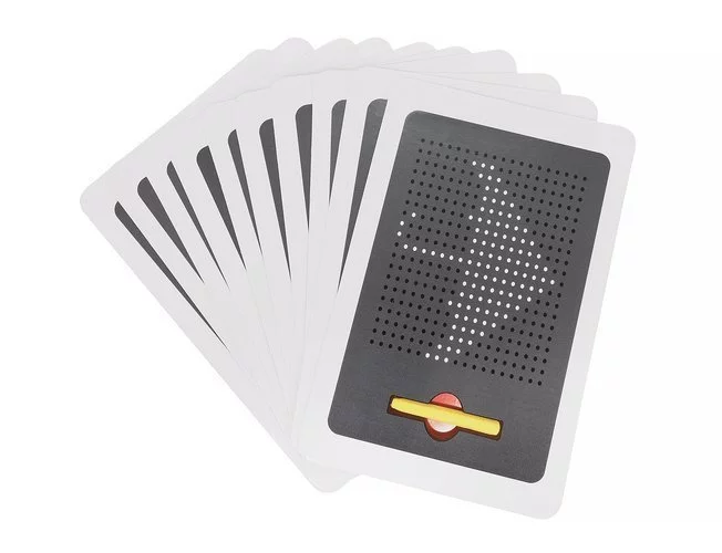 Do 20 wzorów demonstracyjnych - Zestaw zawiera dwustronne karty z 20 wzorami rysunków (serce, kociak, statek, domek, samochód itp.) oraz magnetyczny stylus, który znajduje się w uchwycie z boku planszy do gry. Każdy wzór można łatwo usunąć potrząsając planszą lub naciskając kulki wewnątrz.