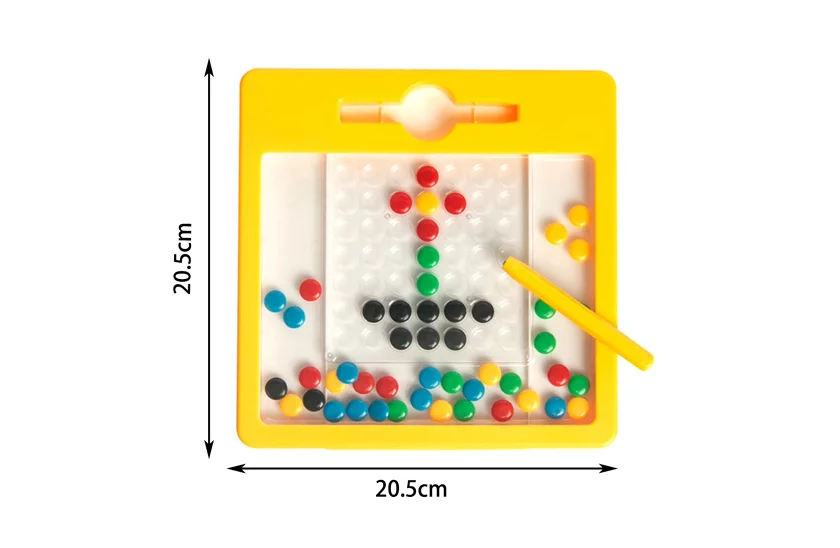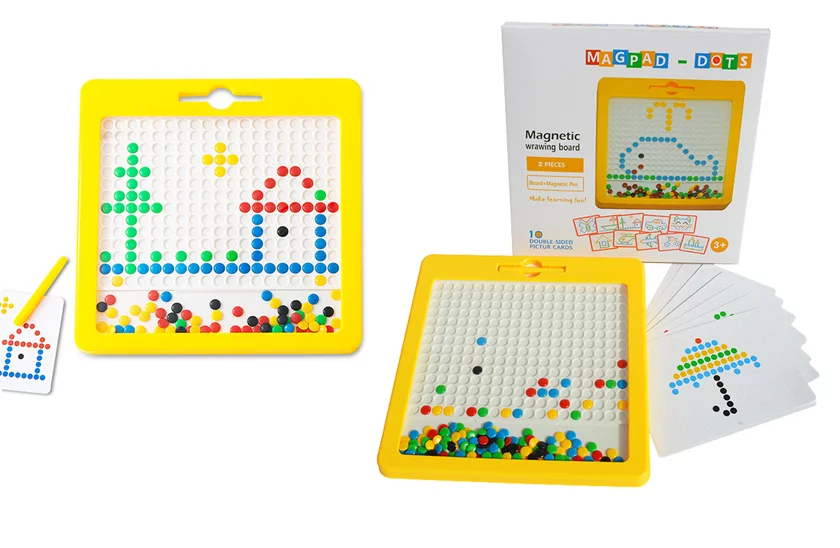 Tablica magnetyczna to magiczna tablica, która daje dzieciom pełną swobodę tworzenia kolorowych kształtów i wzorów. Rozwija małą motorykę u dzieci, wspomaga koordynację ręka-oko, rozbudza wyobraźnię i chęć własnej twórczości. Wewnątrz stolika znajdują się kolorowe, metalowe soczewki. Magnetyczna tablica kreślarska dla dzieci jest łatwa do przenoszenia, zmieści się w każdej torbie podróżnej. To idealna zabawka na długie wycieczki.