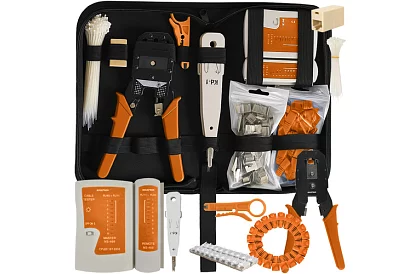• Kompletny zestaw narzędzi sieciowych – szczypce do zaciskania, szczypce do ściągania izolacji, dziurkacz, złącza RJ45 i osłony