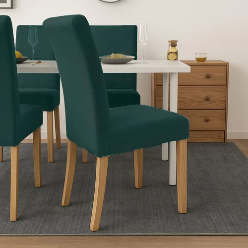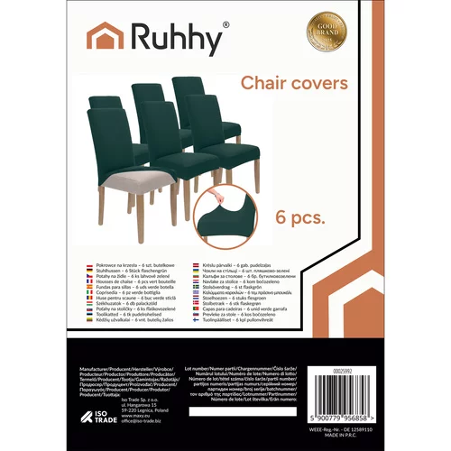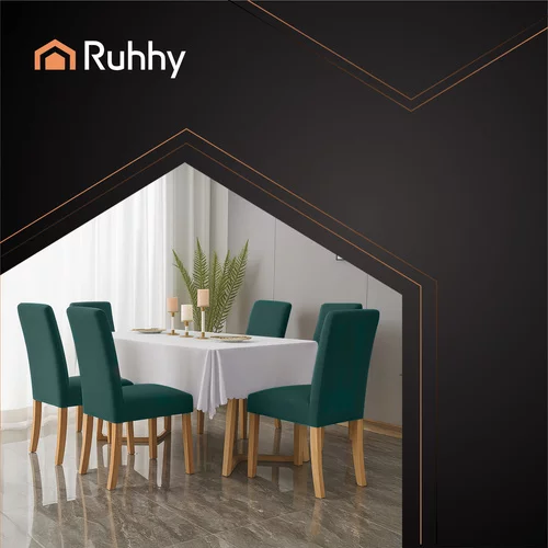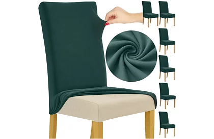 Pokrowce RUHHY łączą elegancję, komfort i ochronę krzeseł. Wykonane z miękkiego poliesteru i elastycznego spandeksu, przylegają do każdego krzesła i chronią je przed zanieczyszczeniami i uszkodzeniami. Butelkowo zielony kolor pasuje do różnych stylów wnętrzarskich, a uniwersalny rozmiar 65 × 40 × 35 cm pasuje do większości standardowych krzeseł.