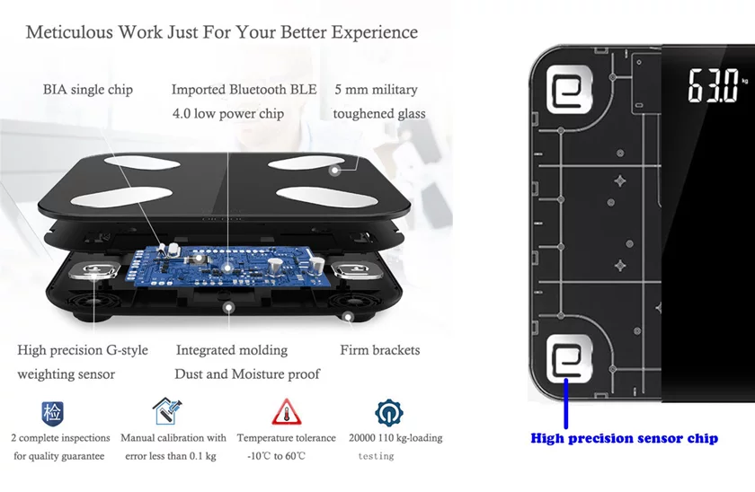 Dzięki wbudowanemu modułowi Bluetooth waga może dokonywać szczegółowych pomiarów masy ciała, obliczać BMI, mierzyć zawartość tkanki tłuszczowej, zawartości wody w organizmie oraz stan masy kostnej i mięśniowej. Powierzchnia skali wykonana jest ze szkła hartowanego.