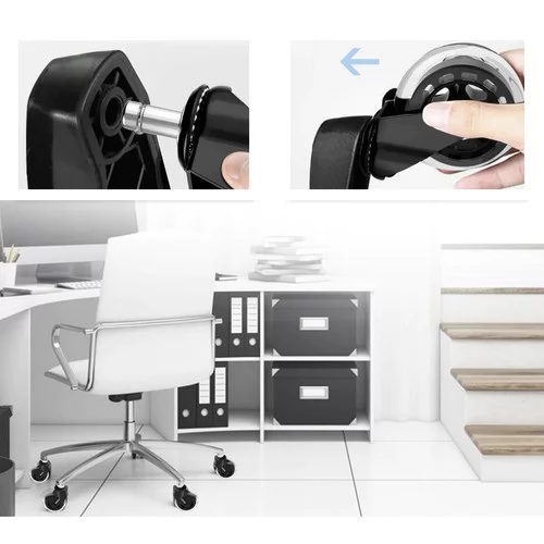 Zestaw zapasowych kółek jest idealny do biurowych, gamingowych, obrotowych i dziecięcych krzeseł. Wykonane z wysokiej jakości gumy chroni podłogę przed zarysowaniami i jednocześnie zapewnia cichą i płynną pracę krzesła. Instalacja jest łatwa dzięki systemowi push-and-click, więc w mgnieniu oka możesz nadać swojemu fotelowi nowe życie.