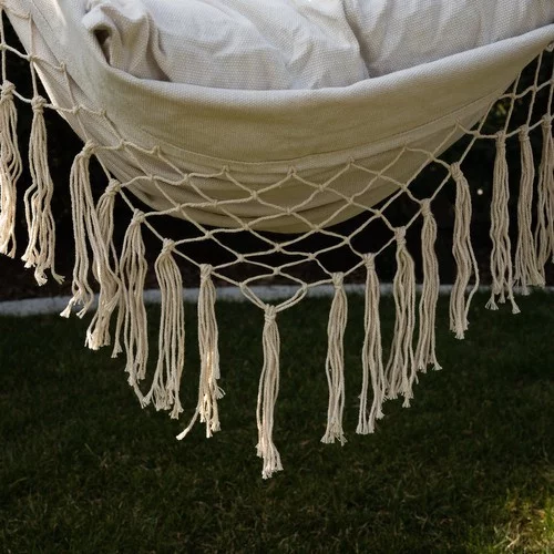 Wygodne fotel wiszący do codziennej relaksacji w ogrodzie, na tarasie i balkonie. Połączenie naturalnej bawełny i wytrzymałego poliestru zapewnia komfortowe siedzenie, dobrą przepuszczalność powietrza i długą żywotność. Stabilna konstrukcja z drewnianą poprzeczką pomaga utrzymać prawidłową pozycję ciała podczas czytania, odpoczynku lub krótkiej drzemki. W zestawie znajdują się dwa miękkie poduszki, które znacznie zwiększają komfort.