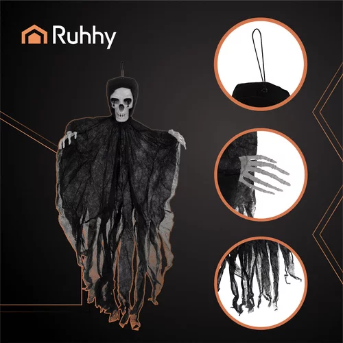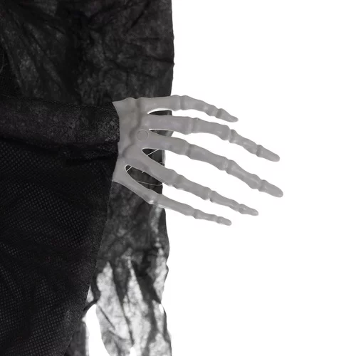 Imponująca dekoracja halloweenowa, która natychmiast wprowadza atmosferę grozy. Realistyczna czaszka z czaszką i postrzępionym materiałem tworzy dramatyczny efekt. Dzięki lekkiej konstrukcji i uchwytowi do zawieszenia można umieścić szkielet wszędzie – na suficie, drzwiach, lampie lub w ogrodzie. Poruszający się materiał na wietrze dodaje iluzji unoszącego się zjawiska, a duży rozmiar zapewnia, że dekoracja przyciąga uwagę. Idealny na Halloween, tematyczne imprezy lub dekoracje sceniczne.