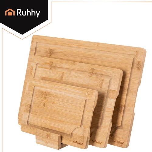 Zestaw trzech bambusowych desek Ruhhy oferuje praktyczne i higieniczne rozwiązanie do krojenia i serwowania. Różne rozmiary pozwalają wybrać idealną powierzchnię do owoców, warzyw, chleba lub mięsa. Naturalny bambus jest lekki, trwały i delikatny dla noży, podczas gdy rowki do odprowadzania płynów utrzymują powierzchnię roboczą w czystości. W zestawie znajduje się praktyczny stojak, który zapewnia przejrzyste przechowywanie i oszczędza miejsce na blacie kuchennym, przy czym każdy element ma swoje miejsce.
