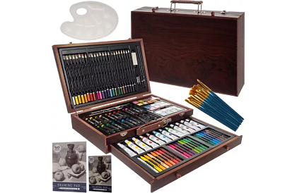 Kompletny zestaw artystyczny w praktycznej drewnianej walizce oferuje 130 elementów do malowania, rysowania i twórczości. Dzięki przemyślanym przegródkom wszystkie narzędzia są uporządkowane, łatwo dostępne i bezpiecznie przechowywane. Dzieci i dorośli mogą rozwijać swoją wyobraźnię, tworzyć oryginalne dzieła i mieć wszystkie narzędzia pod ręką. Walizka jest idealna do użytku domowego, w szkole i w warsztatach kreatywnych.