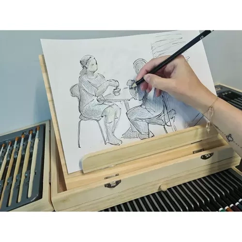 Ogromny wybór 83 elementów pozwala rozwijać kreatywność i wyobraźnię każdego artysty. Zestaw malarski zawiera wszystko, co potrzebne do tworzenia sofistykowanych i oryginalnych dzieł sztuki – od pędzli, ołówków i kredek po farby i sztalugi. Dzięki praktycznej drewnianej walizce ze sztalugą dostęp do poszczególnych komponentów jest szybki i wygodny, a wszystkie elementy są przejrzyście uporządkowane, co ułatwia utrzymanie porządku i bezpieczeństwa podczas użytkowania.