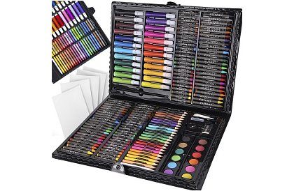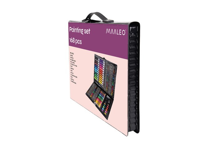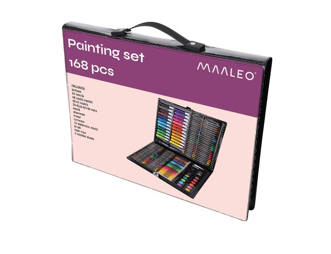 168 elementów – ogromny wybór 24 kredek, 24 markerów, 48 pasteli olejowych, 48 pasteli świecowych, 12 farb akwarelowych, pędzel, paleta malarska, temperówka, ołówek, gumka, klej, korektor i 5 arkuszy papieru A4 pozwala na stworzenie najbardziej kreatywnych, oryginalnych i wymagających dzieł.