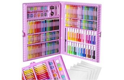 168 elementów – zestaw zawiera 24 kredek, 24 markerów, 48 pasteli olejnych, 48 pasteli świecowych, 12 farb akwarelowych, pędzel, paletę malarską, temperówkę, ołówek, klej, korektor, gumkę i 5 arkuszy papieru A4, dzięki czemu dzieci łatwo stworzą najbardziej kreatywne i oryginalne dzieła.