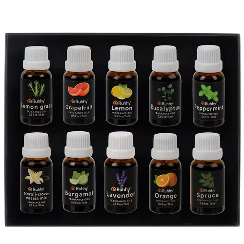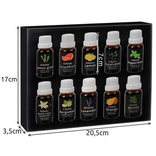Oleje eteryczne RUHHY wprowadzają do Twojego domu przyjemny zapach i harmonię. Każda buteleczka jest higienicznie zamknięta i gwarantuje świeżość, co umożliwia natychmiastowe użycie w dyfuzorach, lampach aromatycznych, nawilżaczach lub świecach. Zestaw jest dodatkowo elegancko zapakowany i nadaje się na oryginalny prezent, który ucieszy każdego miłośnika zapachów.