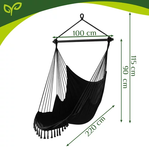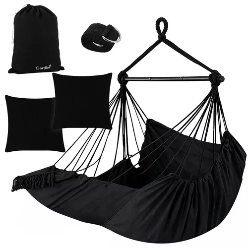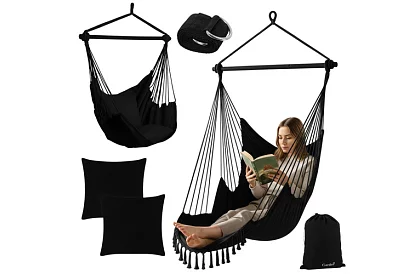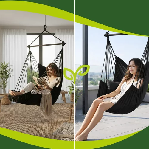 Fotel wiszący ogrodowy zapewnia maksymalny komfort i relaks w ogrodzie, na balkonie, tarasie lub w salonie. Wytrzymała bawełniana tkanina i stabilny metalowy stelaż zapewniają bezpieczne kołysanie oraz komfortowe siedzenie lub leżenie. Dwie miękkie poduszki zapewniają natychmiastowy komfort, a ergonomiczny kształt fotela wspiera prawidłową postawę ciała. Doskonały wybór do czytania, odpoczynku lub spokojnej chwili relaksu.