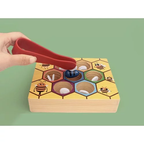 Złap pszczółkę to zabawna i edukacyjna gra, która zajmie twoje dziecko i jednocześnie wspiera jego rozwój. Dzieci ćwiczą małą motorykę, koordynację ręka-oko i dotykowe postrzeganie podczas chwytania pszczółek pincetą z drewnianej plastra. Każda pszczółka ma inny kolor i skrzydła z filcu, co pobudza kreatywność i wyobraźnię najmłodszych.