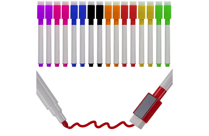 Zestaw zawiera 16 markerów w 8 kolorowych barwach, które umożliwiają łatwe i przejrzyste pisanie na białych tablicach, szkle, ceramice, metalu i plastiku. Markery są wyposażone w praktyczną gumkę do wymazywania na końcu zamknięcia, dzięki czemu notatki można łatwo usunąć na sucho bez pyłu – idealne dla alergików. Magnes na boku zamknięcia zapewnia, że markery nie zginą i można je wygodnie przymocować do tablicy. Doskonały pomocnik do szkół, biur, sal konferencyjnych i domów.